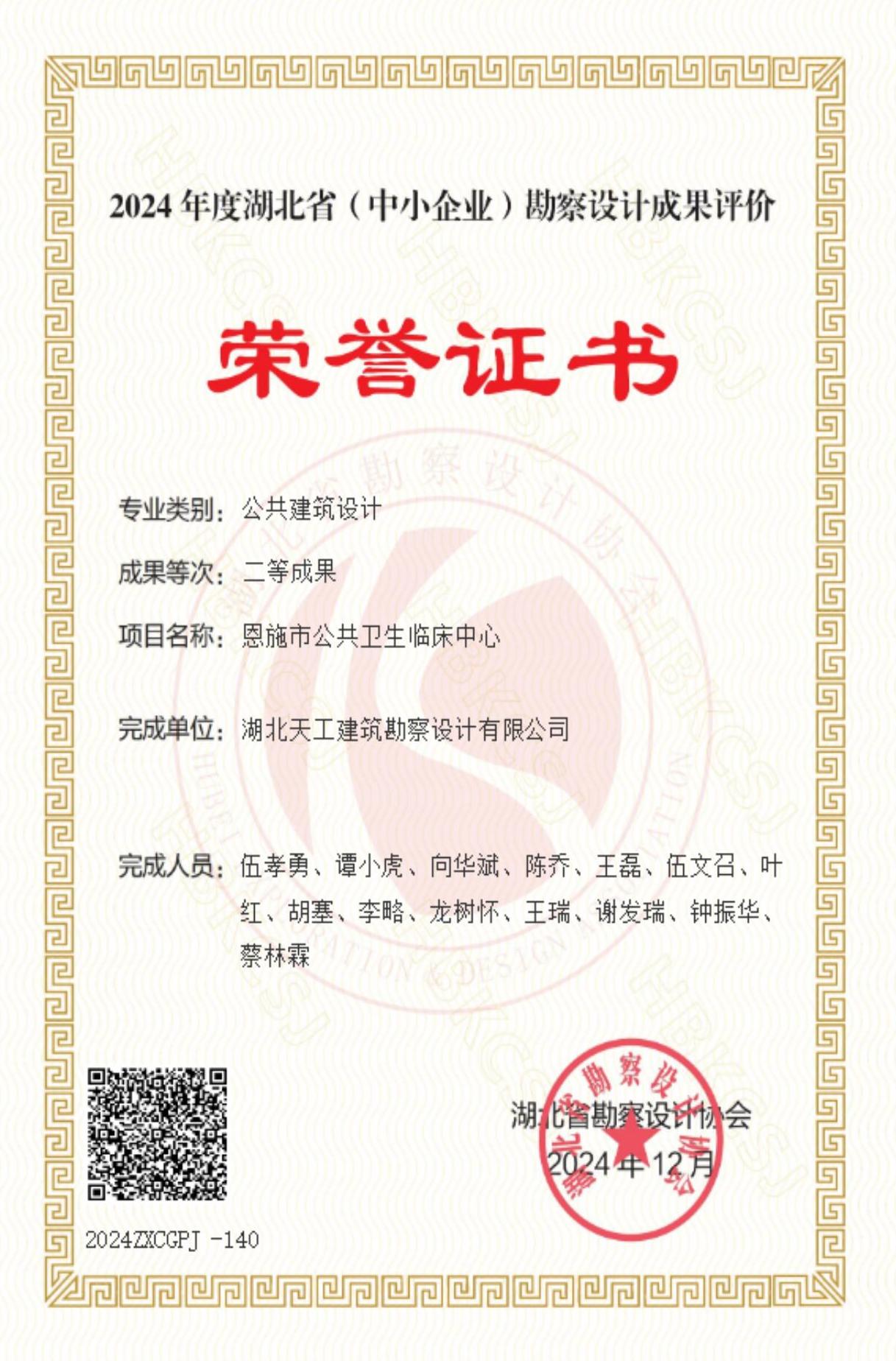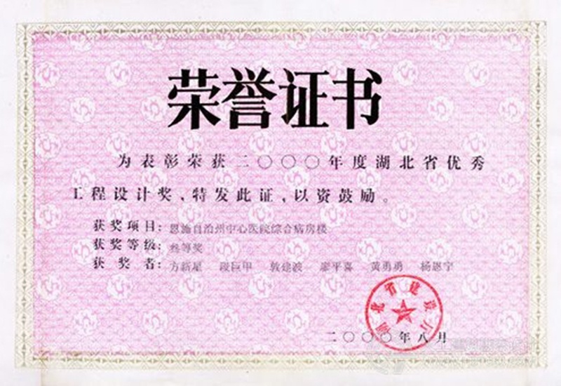 “二〇〇〇年度湖北省優秀工程設計獎”榮譽證書