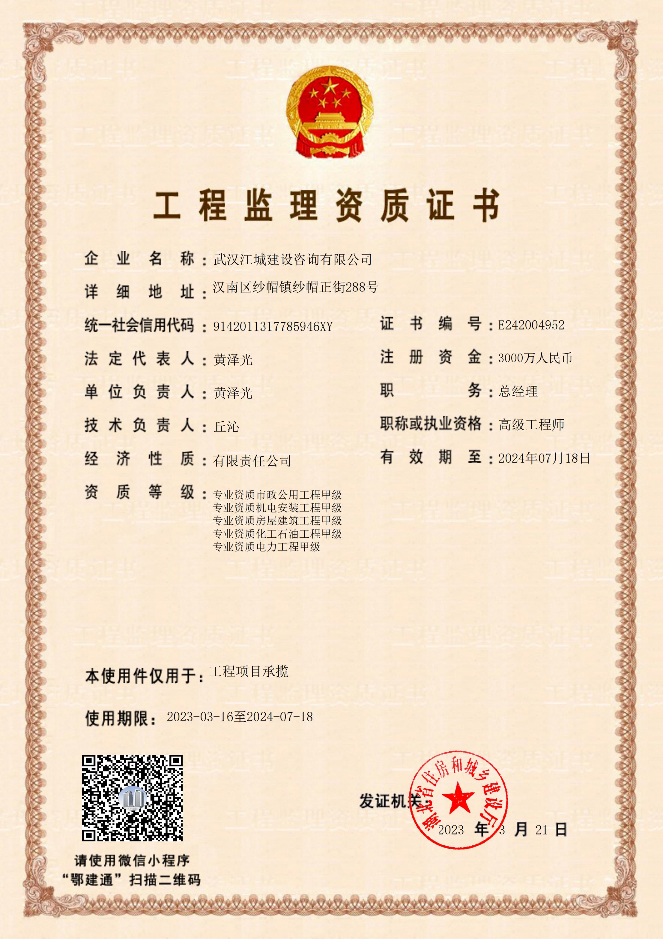 2023年3月17日,湖北省住房和城鄉(xiāng)建設(shè)廳公布了核準的工程監(jiān)理企業(yè)資質(zhì)——武漢江城建設(shè)咨詢有限公司(以下簡稱“武漢江城”)獲電力、化工石油專業(yè)甲級資質(zhì),形成了具備房建、市政、機電、電力、化工石油五項甲級資質(zhì)的“新江城”。“新江城”將以踔厲奮發(fā)、篤行不怠的姿態(tài)勇毅前行,力行盡快申請到綜合級監(jiān)理資質(zhì),屆時武漢江城將會以監(jiān)理為契機,重組相關(guān)設(shè)計資質(zhì),努力為開拓發(fā)展全過程工程咨詢服務(wù)創(chuàng)造條件。