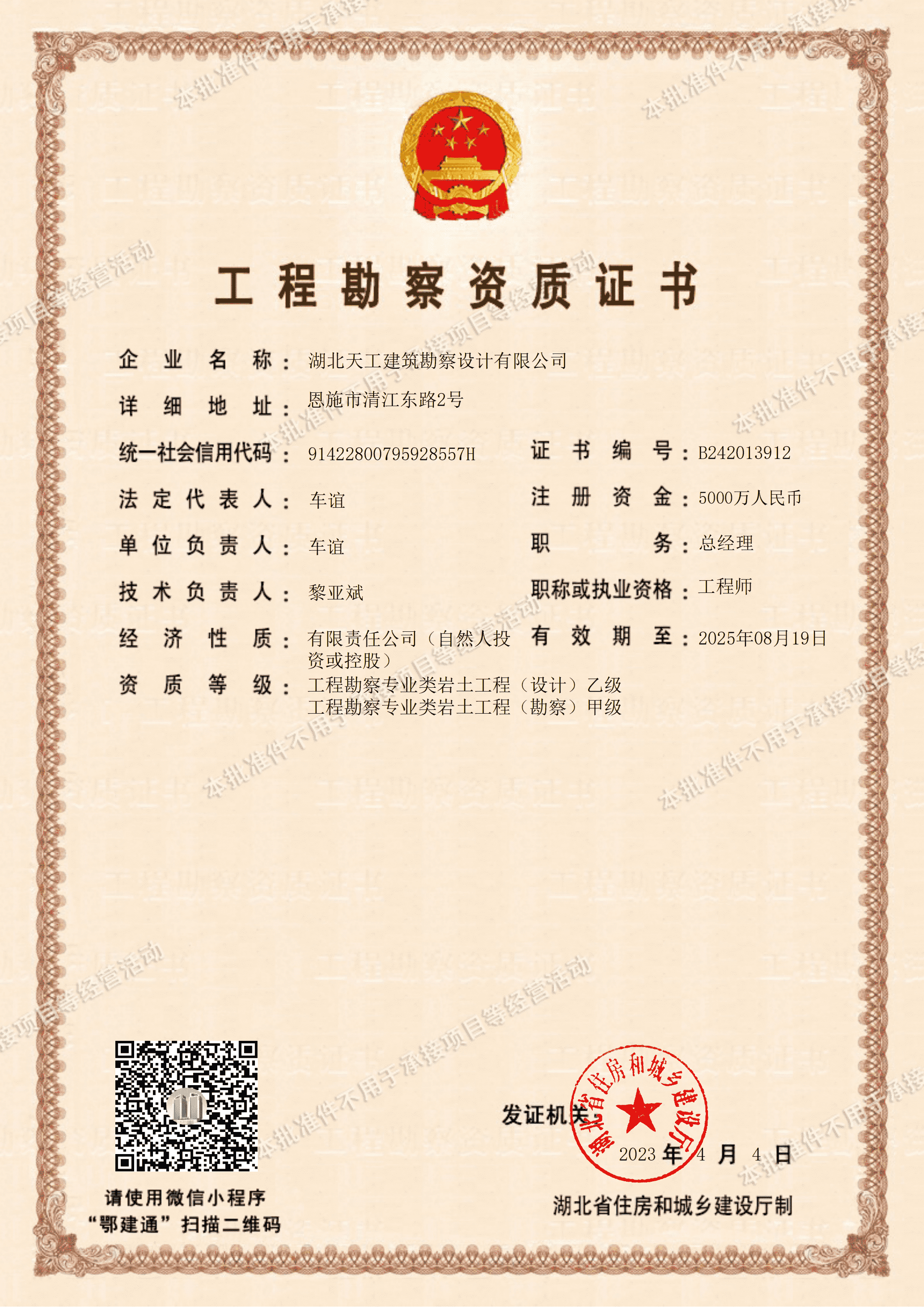 湖北天工建筑勘察設(shè)計(jì)有限公司(以下簡(jiǎn)稱“天工院”)近日取得工程勘察巖土工程專業(yè)(巖土工程勘察(勘察))甲級(jí)資質(zhì)。
